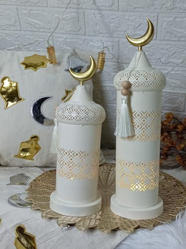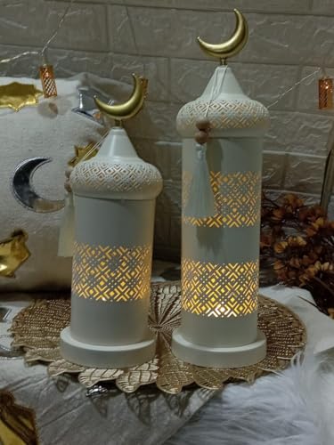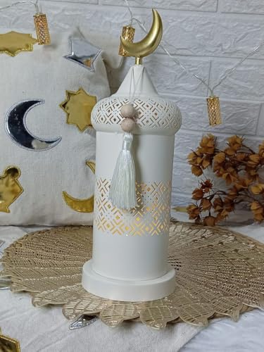 Generic - استاند معدني ديكور إسلامي مع قمة هلال ذهبي، أبيض مع نمط هندسي مخرم، شمعدان زينة رمضانية، متوفر بحجمين، مع شرابة تزيينية (31 سم)