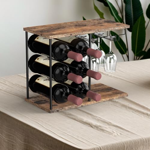 Shinoske - رف معدني لحفظ النبيذ، حامل تخزين قائم بذاته مع شماعة للاواني الجذعية، منظم تخزين لسطح الطاولة، 3 طبقات 6 زجاجات، حامل زجاجات عتيق، رف نبيذ للخزانة وطاولة المطبخ