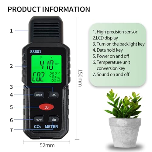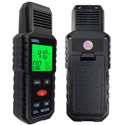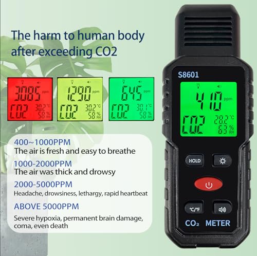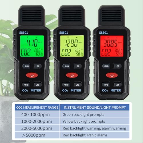 Metellme - جهاز محمول باليد 3 في 1 لقياس نسبة ثاني أكسيد الكربون مع انذار، كاشف CO2 بمدى من 400 إلى 5000 جزء في المليون مع شاشة بثلاثة ألوان، مراقب جودة الهواء، فاحص درجة الحرارة والرطوبة من ميتيلمي