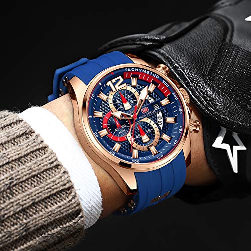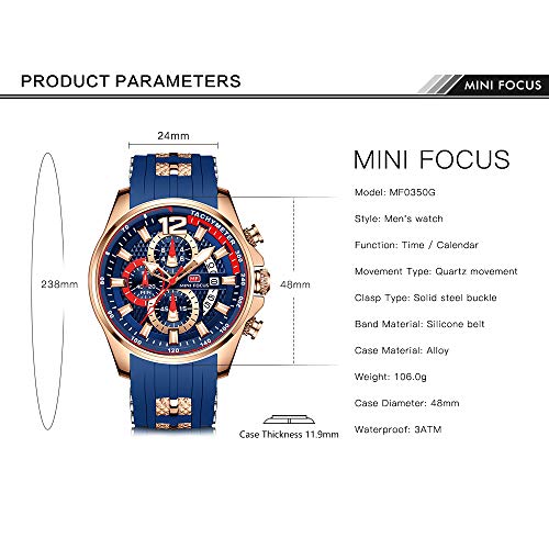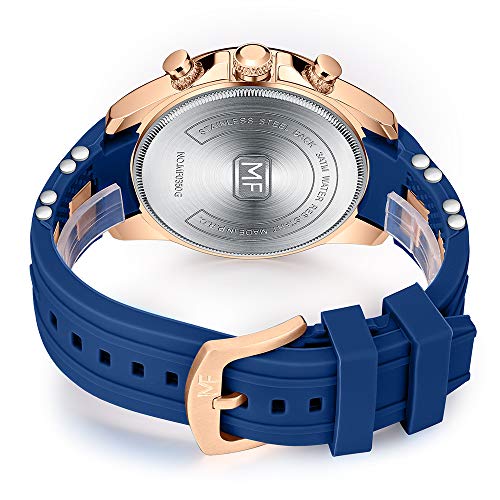 MF MINI FOCUS - ساعة كرونوغراف كوارتز للرجال بسوار سيليكون من ميني فوكس يد رياضية مضيئة مقاومة للماء مع تاريخ تلقائي 0350 روز جولد أزرق