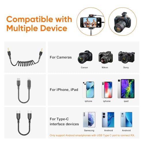 - 🎤【ميكروفون لافالير للتوصيل والتشغيل】 ببساطة قم بتوصيل جهاز الاستقبال مباشرة بجهاز ايفون أو ايباد. سيتم إقران جهاز الإرسال والاستقبال تلقائيًا في ثانية واحدة بمجرد تشغيل الميكروفون. لا يتطلب محول تطبيق أو بلوتوث.