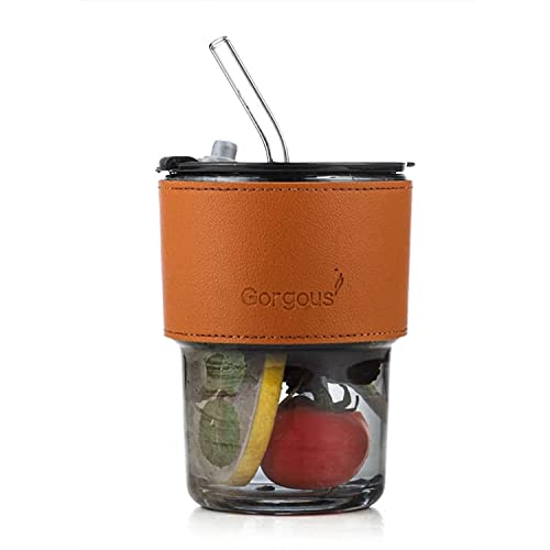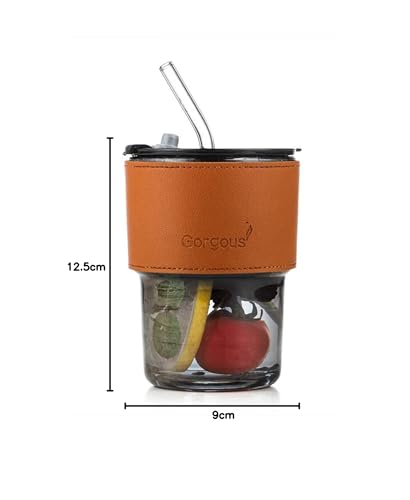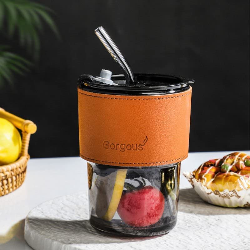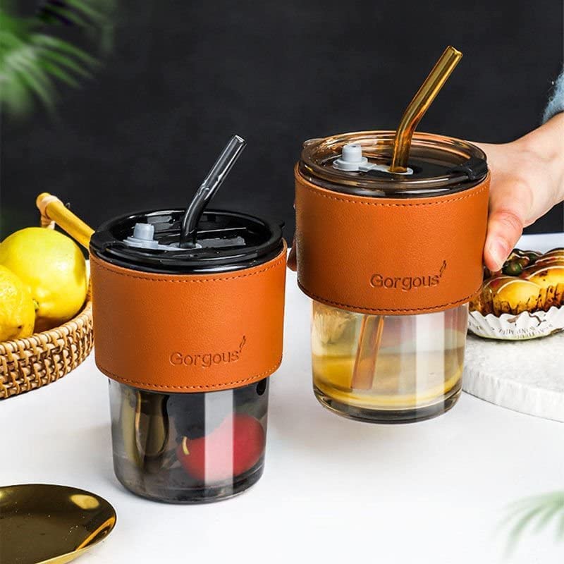 MIBRU - كوب من الزجاج مع شفاطة وغطاء وحافظة من الجلد مقاومة للحرارة من ميبرو بسعة 450 مل للقهوة والشاي والعصير واللبن والماء للمكتب والسفر
