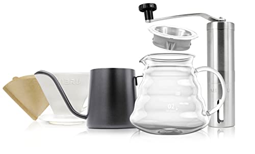 - ☕ تتكون مجموعة القهوة من: إبريق ماء للقهوة بالتنقيط، فلاتر ورقية لتصفية القهوة، أداة تقديم قهوة بالتنقيط الزجاجية، مطحنة قهوة من الستانلس ستيل، قمع تقطير زجاجي مناسب لجميع فلاتر V60