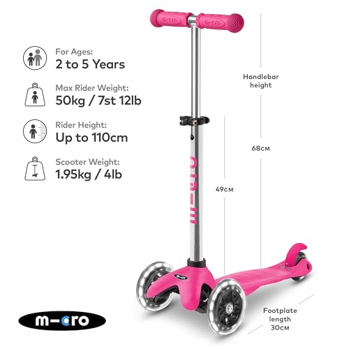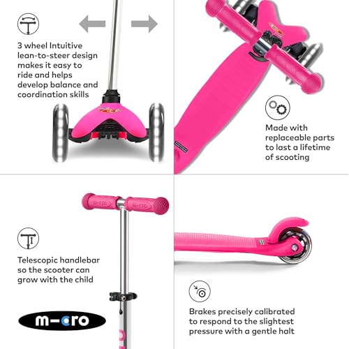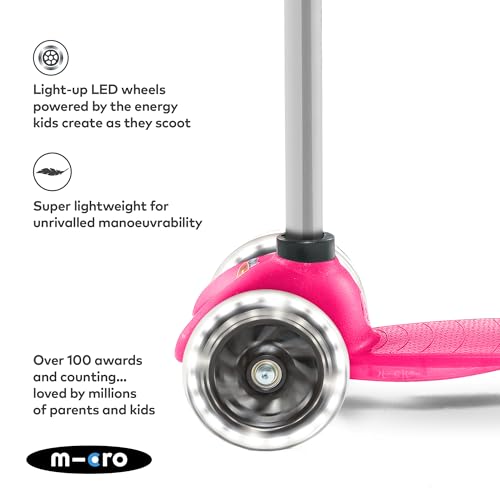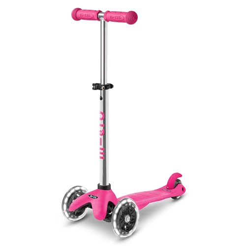 Micro - سكوتر صغير ليد للأطفال بمقود قابل للتعديل، سكوتر بعجلات مضيئة للأولاد والبنات من ميكرو سكوترز، من عمر 2-5 سنوات - وردي