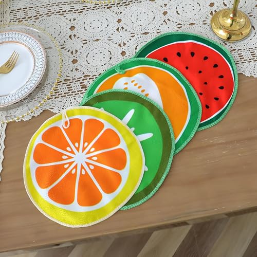 Generic - فوطة من المايكروفايبر بتصميم فاكهة كرتونية ناعمة ومريحة، شكل دائري، مثالية للامتصاص اليومي، مثالية للاطفال والبالغين، ميزة تعليق مريحة لسهولة التخزين (4 قطع من الالوان المعروضة)
