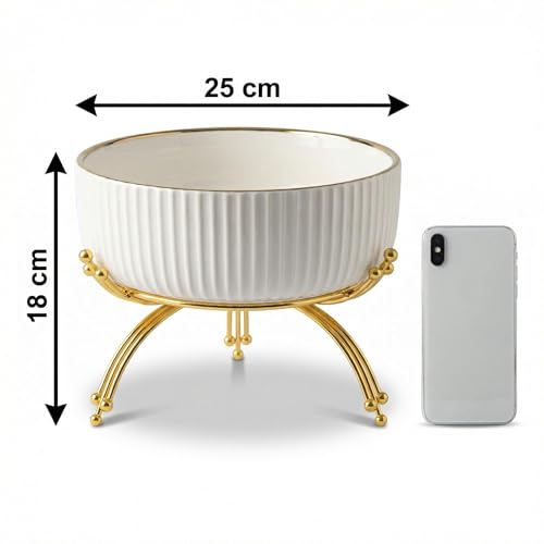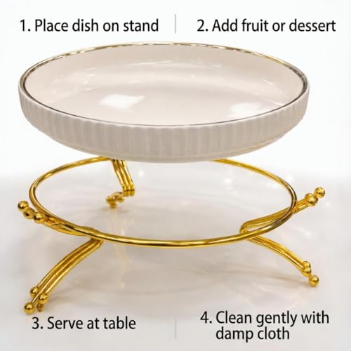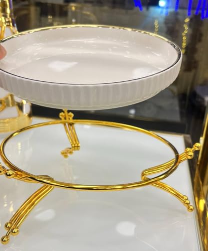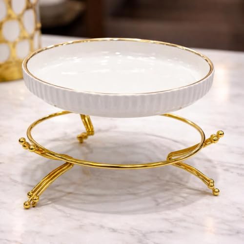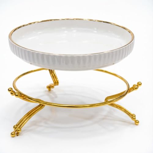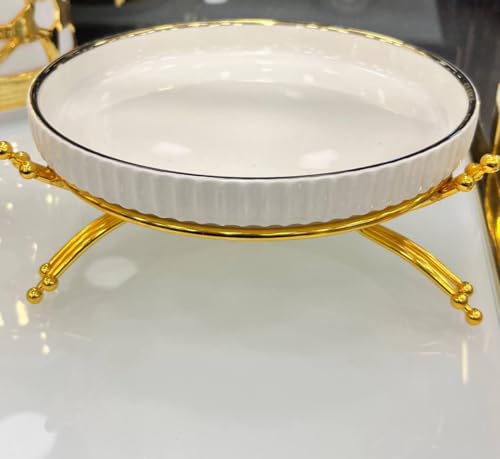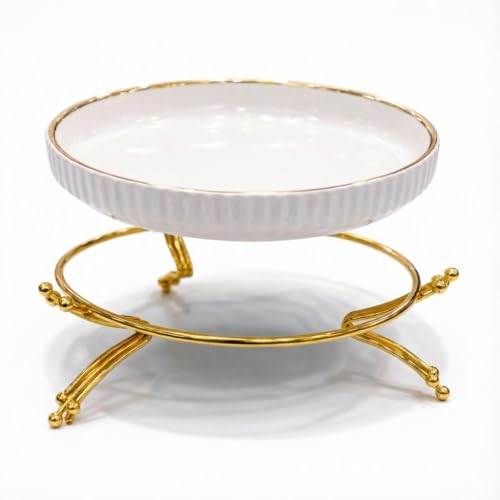 Generic - سيراميك امن للاستخدام في الميكروويف - وعاء تقديم ابيض انيق مع حامل ذهبي وسطح مضلع، دائري ومتين وامن للاستخدام اليومي (موديل 2)