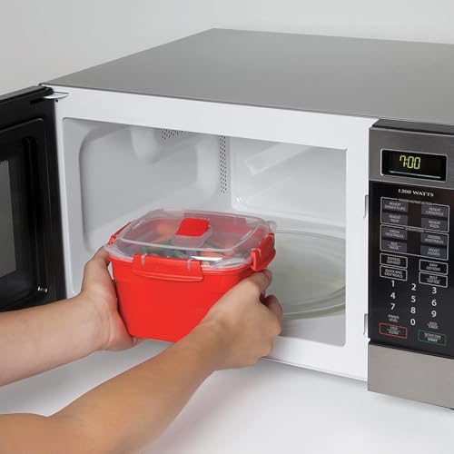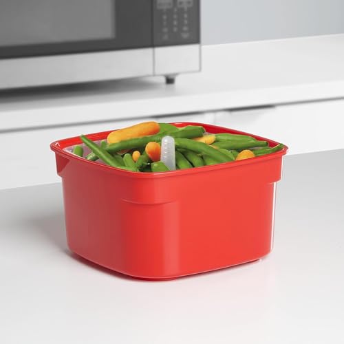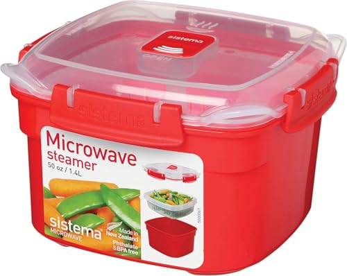 Generic - مكواة بخار للميكروويف مع سلة بخار قابلة للإزالة | طعام مربع صغير سعة 1.4 لتر | خالية من BPA | أحمر / شفاف سيستيما