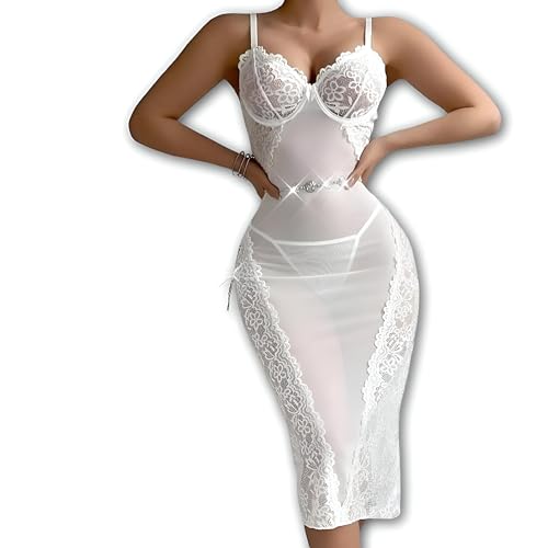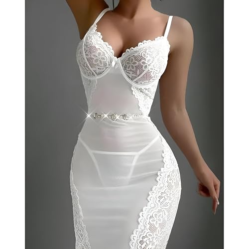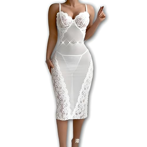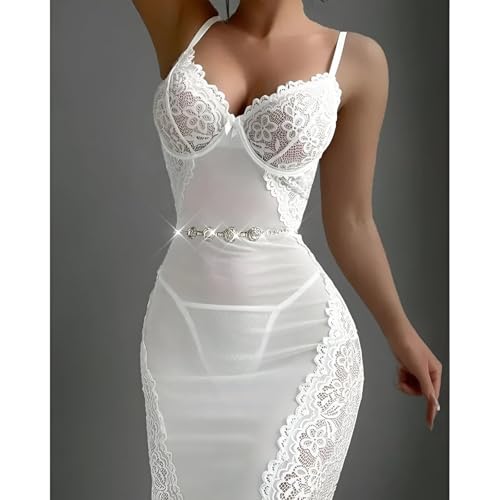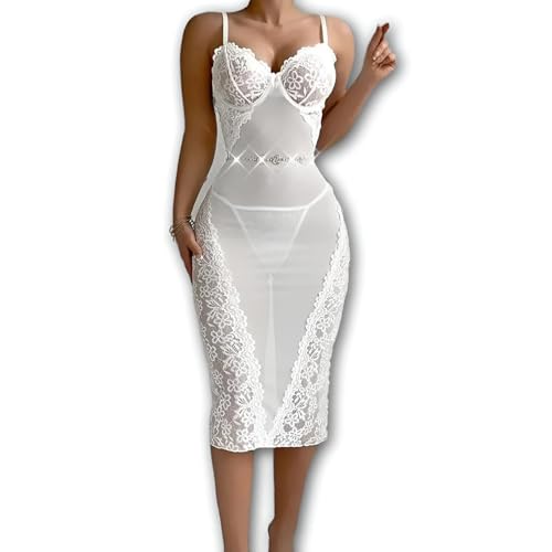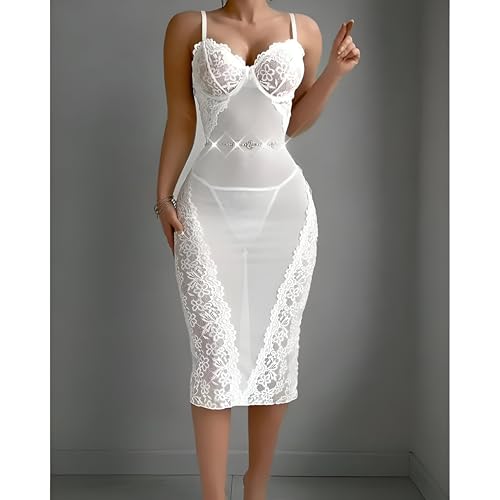 Generic - فستان متوسط الطول - فستان متوسط الطول من الدانتيل الأبيض يتميز بأكواب حمالة صدر مدمجة وحزام خصر مزخرف، مصنوع للحصول على صورة ظلية ناعمة وراحة خفيفة الوزن وأشرطة قابلة للتعديل وتصميم لا يتأثر بمرور