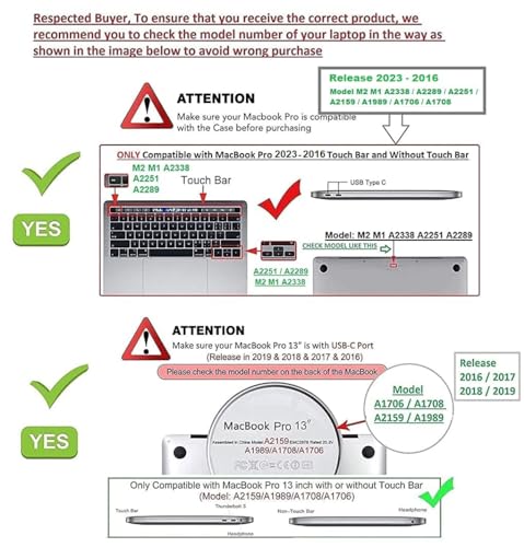 - مقاس مثالي: تم تصميم الجراب فقط ليتوافق مع ماك بوك برو مقاس 13 بوصة مع شريط لمس وخاصية تاتش اي دي (بصمة الإصبع عن طريق اللمس)، الموديل: M1 A2338 / A2289 / A2251 / A1706 / A2159 / A1989 وبدون شريط لمس A1708 -- إصدار 2020 - 2016. يرجى إلقاء نظرة على الجزء السفلي من جهاز ماك بوك الخاص بك للتحقق من رقم الموديل كما هو موضح في الصورة لتجنب الشراء الخاطئ