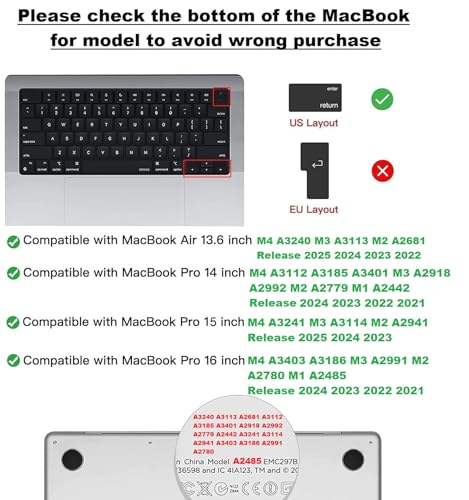 - متوافق مع: تم تصميم جراب لوحة المفاتيح ليكون متوافقًا فقط مع ماك بوك اير مقاس 15 بوصة M2 إصدار 2023 - الطراز A2941 بشريحة، متوافق مع ماك بوك اير مقاس 13.6 بوصة M2 إصدار 2022 2023 - الطراز A2681 بشريحة، متوافق مع ماك بوك برو مقاس 14 بوصة M3/ M2/ M1 برو/ ماكس إصدار 2023 2022 2021 - الطراز A2918/ A2992/ A2779/ A2442 بشريحة ومتوافق مع ماك بوك برو مقاس 16 بوصة M3/ M2/ M1 برو/ ماكس إصدار 2023 2022 2021 - الطراز A2991/ A2780/ A2485 بشريحة.
