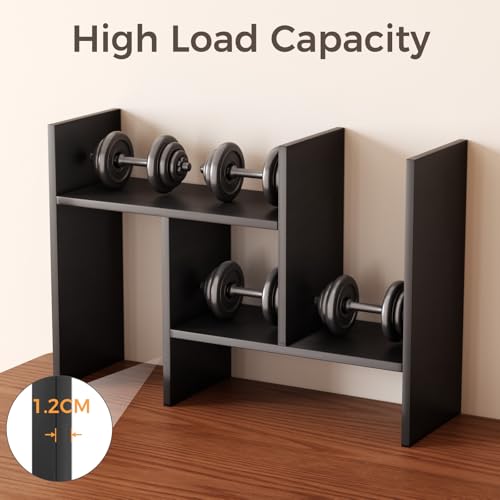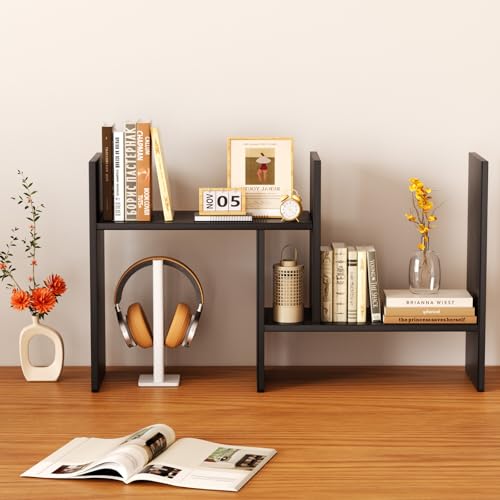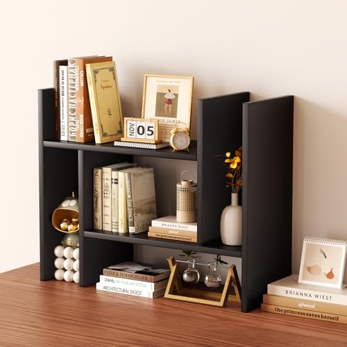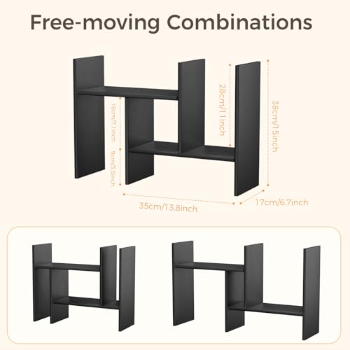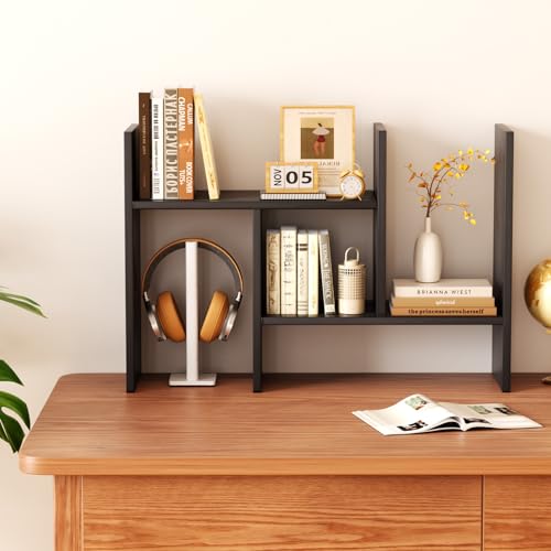 Mihoho - منظم ارفف سطح المكتب من ميهوهو، رف كتب خشبي قابل للتعديل، رف تخزين للمكتب، رف عرض خشبي للمنزل والدراسة والمكتب (اسود سي)