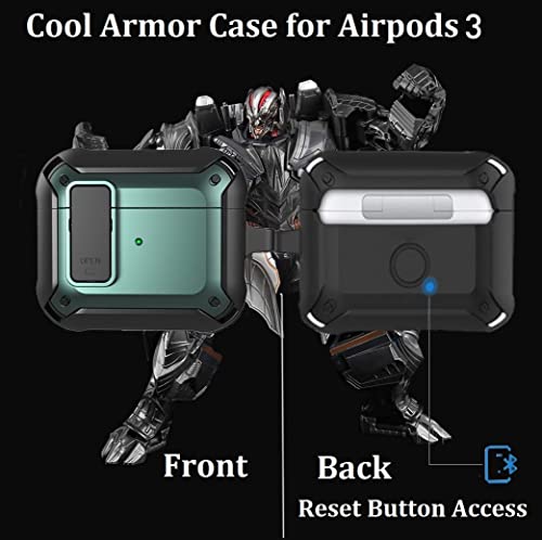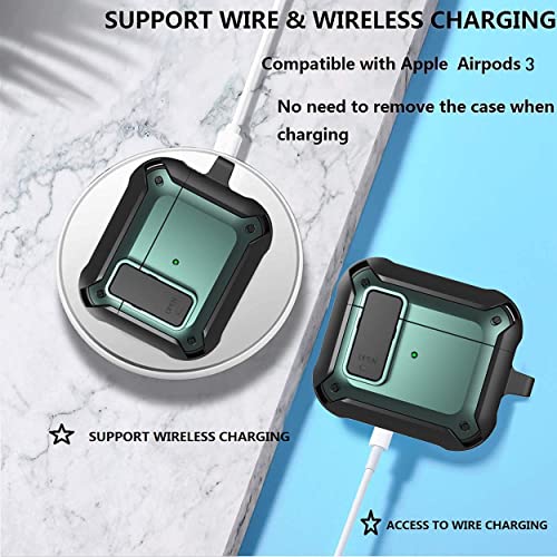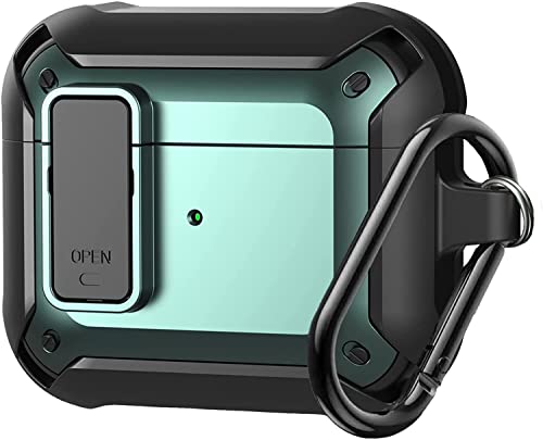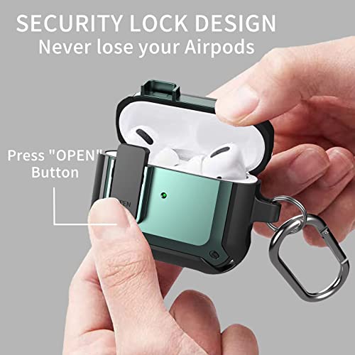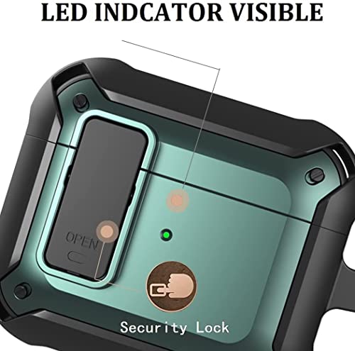 Airpod Case - حافظة حماية ارمور من الدرجة العسكرية للهيكل بالكامل بتصميم صلب متين مع مشبك قفل امان وسلسلة مفاتيح لسماعة ابل اير بود 1 خاصية الشحن اللاسلكي اسود واخضر غامق بولي يوريثين اللدن بالحرارة
