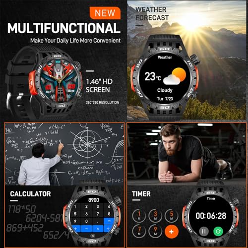 Azonee - ساعة ذكية عسكرية للرجال، مزودة بمصباح ليد وبوصلة، ساعة ذكية رياضية تكتيكية لتتبع النشاط، شاشة 1.46 بوصة HD عالية الدقة تعمل بالبلوتوث لأجهزة اندرويد وiOS من ازوني