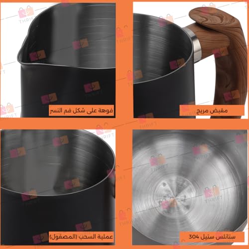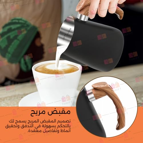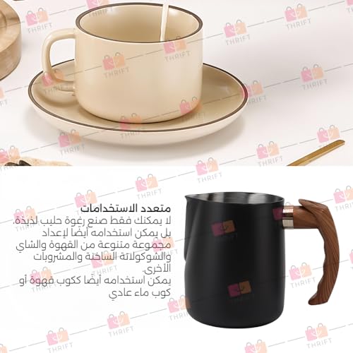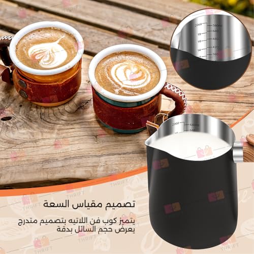 Thrift - إبريق رغوة الحليب، شفشق تبخير الإسبريسو من الفولاذ المقاوم للصدأ بمقبض خشبي مضاد للحروق وعلامات قياس داخلية مع فوهة سكب دقيقة، إبريق باريستا لفن اللاتيه للقهوة والكابيتشينو، 600 ملليلتر