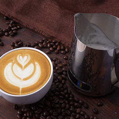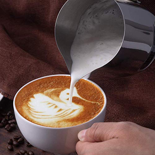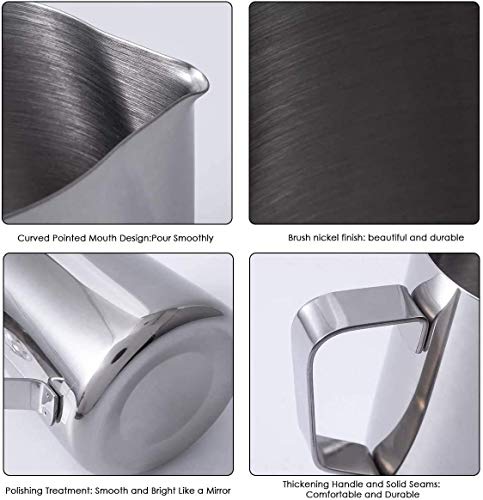 - تصميم فريد: ابريق الحليب المثبت باليد يمنعك من الحرق؛ قاعدة من الفولاذ المقاوم للصدأ المستديرة تجعل من السهل غسلها دون أن تلطخ عند الاختباء؛ تتميز بفوهة ضيقة مثالية للسكب بفصل الرفق بسهولة عن السائل ولعمل فني لاتيه مثالي.