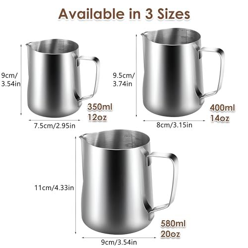 - يتميز إبريق الحليب بسعة 350 مل أو 12 اونصة، مما يجعله بحجم مثالي لصنع رغوة الحليب لكوب أو كوبين من القهوة أو الكابتشينو أو اللاتيه. تسمح علامات القياس داخل الإبريق بالتحكم الدقيق في كمية الحليب المستخدمة، مما يضمن الاتساق في كل مشروب تم إعداده.