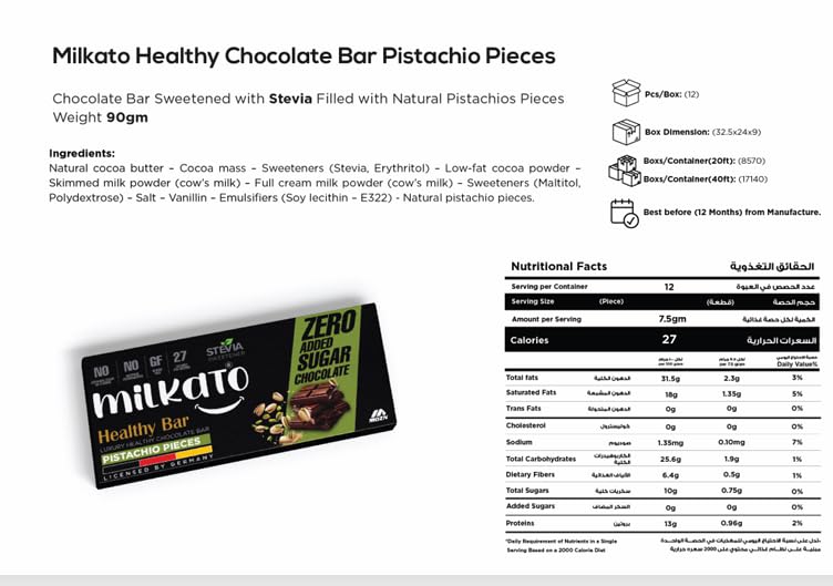 Pharmaceutical and Food Industries - ميلكاتو هيلثي شيكولاتة بار بقطع الفستق 90 جرام