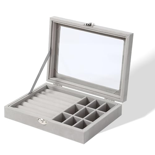 Milnnie - منظم مجوهرات قطيفة بغطاء أكريليك شفاف - صندوق عرض مكون من 9 أقسام بطبقة واحدة مضادة للبهتان للخواتم والحلقان، صينية مجوهرات قابلة للقفل للأدراج أو سطح المكتب، 20 سم × 15 سم × 5 سم من ميلني