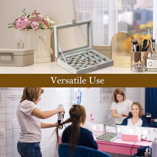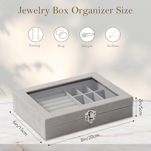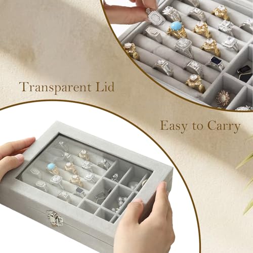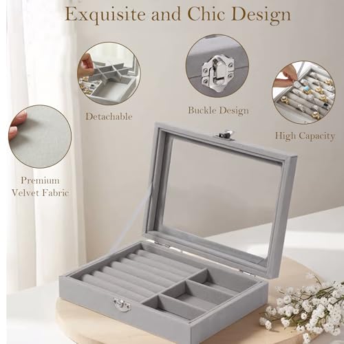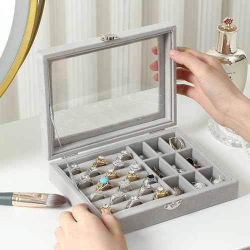 - شاشة عرض أنيقة مع غطاء شفاف: اعرض مجوهراتك بأناقة مع هذا المنظم القطيفة الذي يتميز بغطاء أكريليك شفاف - مثالي لعرض واختيار الأكسسوارات بسهولة دون فتح الصندوق.
