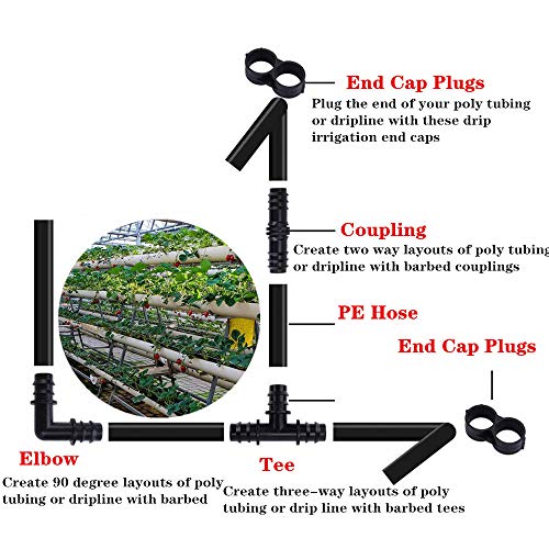 Minelife - مجموعة قطع للري بالتنقيط، بانابيب مقاس 1/2 بوصة (520)، 6 بشكل حرف T و6 بتصميم حرف L و6 باطراف لنهاية الانبوب، موصلات لانظمة الرش او الري بالتنقيط، بـ24 قطعة من ماينلايف