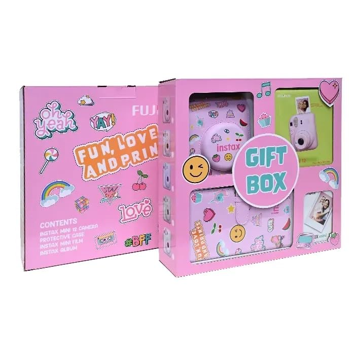 - 1 × كاميرا فوجي فيلم انستاكس ميني 12، 1 × جراب واقي وردي، 1 × ألبوم انستاكس 1 × فيلم انستاكس ميني قياسي