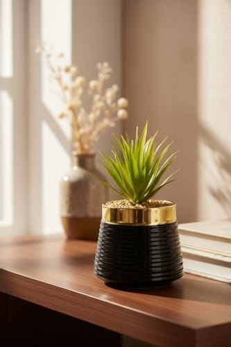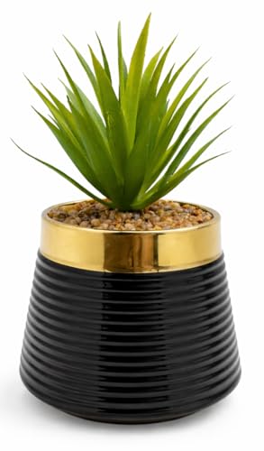 Generic - نبات صبار صناعي صغير في أصيص مضلع بحافة ذهبية، نباتات زينة واقعية لديكور المنزل والمكتب والطاولات (أسود)
