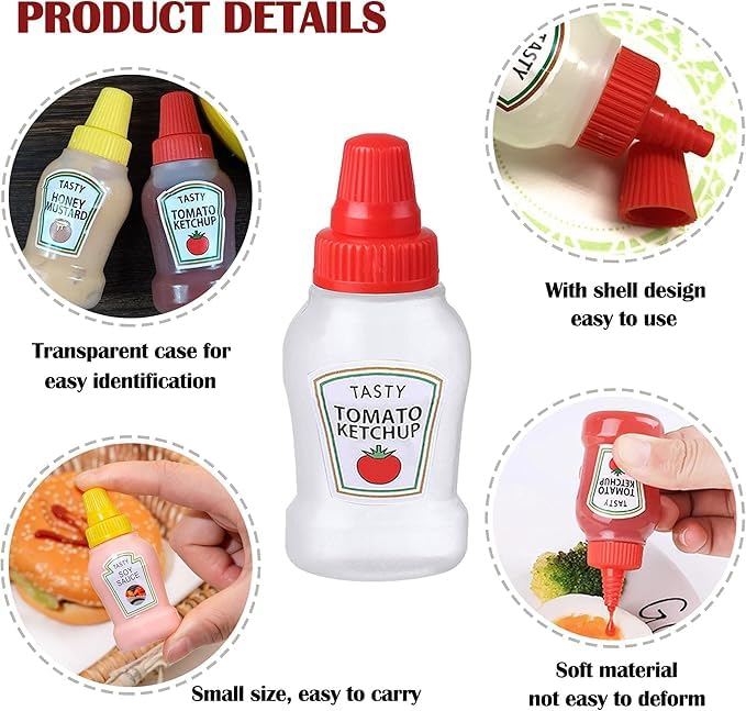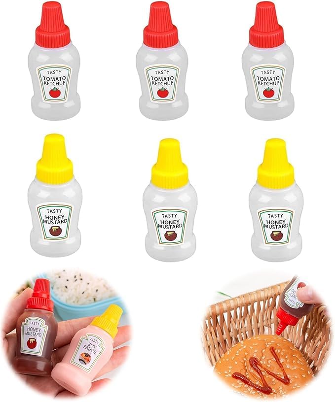 - مجموعة كاملة: عبوة من 6 زجاجات بهارات صغيرة بما في ذلك 3 زجاجات كاتشب بأغطية حمراء و3 زجاجات خردل العسل بأغطية صفراء للعب الأنشطة الغذائية.