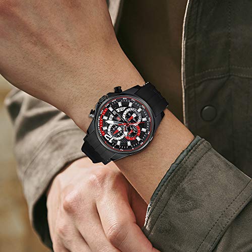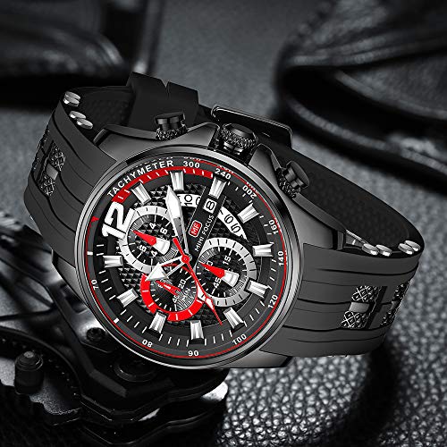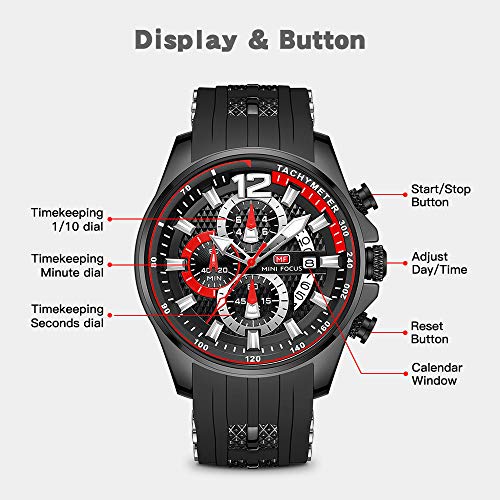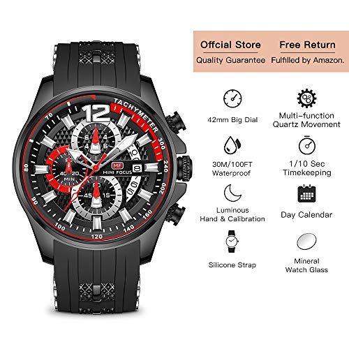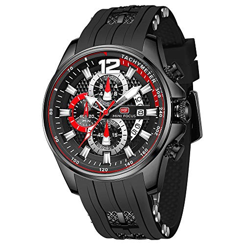 MF MINI FOCUS - ساعة معصم كرونوغراف بحركة كوارتز عصرية كاجوال مقاومة للماء مضيئة بخاصية التقويم بسوار من السيليكون للرجال من ميني فوكاس, الكل أسود