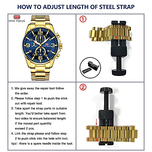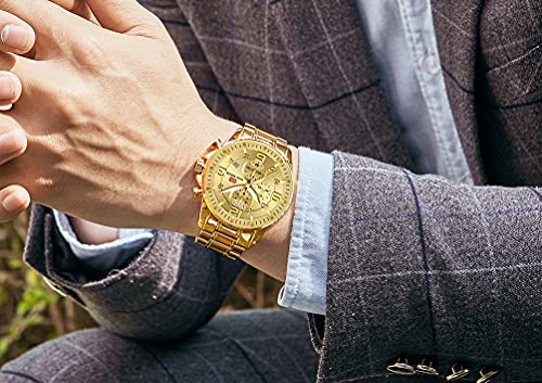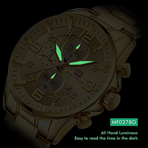 MF MINI FOCUS - ساعة ميني فوكس للرجال فاخرة ذهبية اللون متعددة الوظائف/مقاومة للماء/مضيئة/تقويم عصرية بسوار من الفولاذ المقاوم للصدا ذهبي انالوج