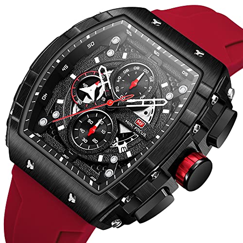 MF MINI FOCUS - ساعة بنمط رياضي عسكري للرجال من ميني فوكس، كوارتز كرونوغراف فاخرة مقاومة للماء بعقارب مضيئة وسوار السيليكون، لون اسود احمر 0399