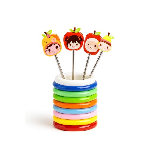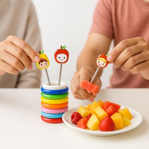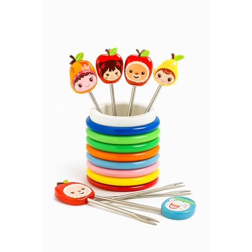Generic - طقم شوك فاكهة صغير للأطفال والضيافة – 8 شوك مع كوب/حامل منظم بحلقات ملونة لسهولة التخزين والعرض
