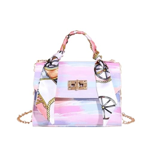 Generic - شنطة يد صغيرة مع حزام سلسلة، طباعة بالوان قوس قزح باستيل، قطع معدنية ذهبية اللون، اغلاق بقفل دوار