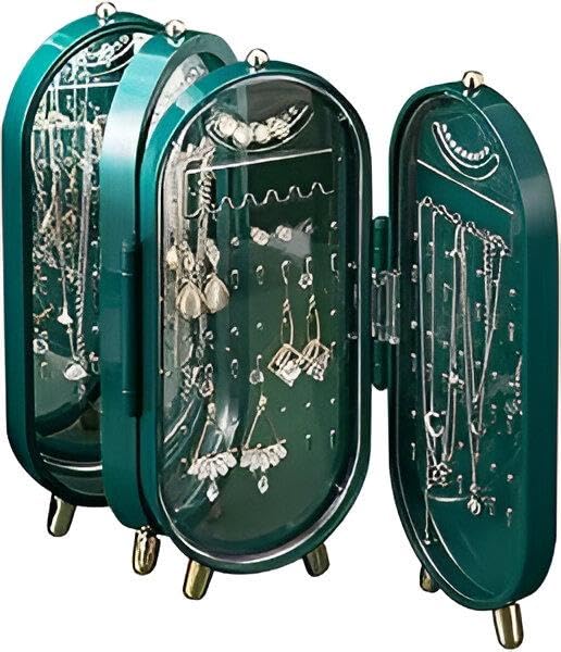 Generic - صندوق مجوهرات صغير مع أبواب قابلة للطي ومراية مدمجة وصواني منظمة للسلاسل والخواتم والحلقان من البلاستيك الأخضر
