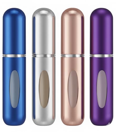 Generic - زجاجة عطر صغيرة قابلة لإعادة التعبئة مع بخاخ محمول مزودة بمضخة للتعبئة مثالية للسفر والتنقل (سعة 5 مل، عبوة من 4 قطع) (لون أزرق، فضي، وردي، أرجواني)