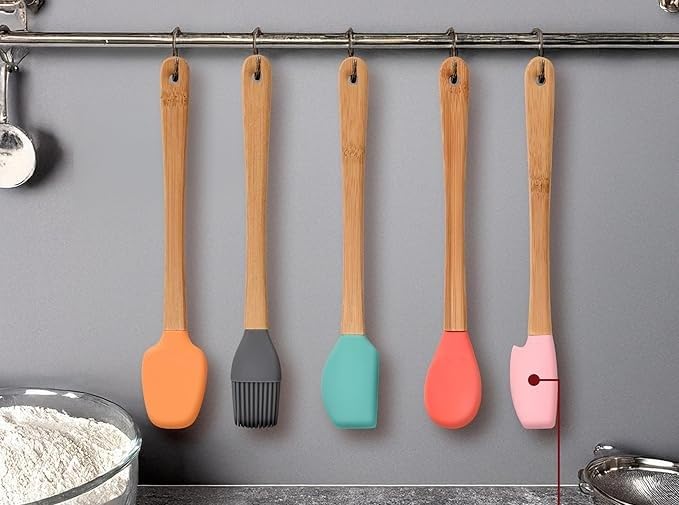 - محتويات الطقم: مجموعة من 5 قطع متنوعة تشمل فرشاة للدهن، معلقة، وثلاث سباتيولا بأحجام مختلفة لتلبية احتياجات الطهي والخبز المتعددة