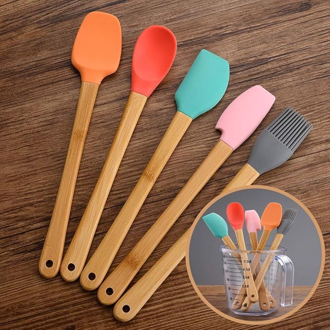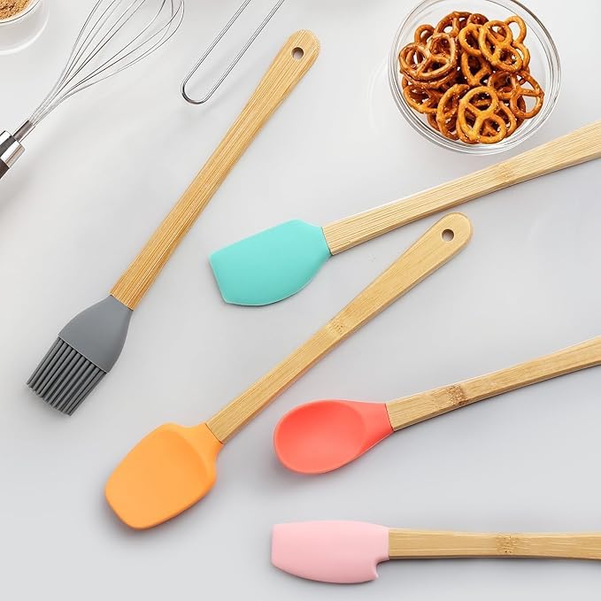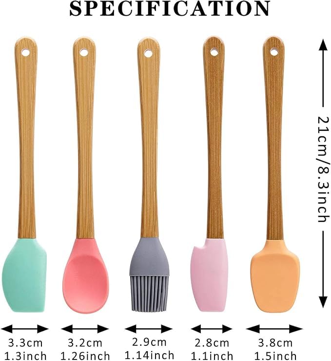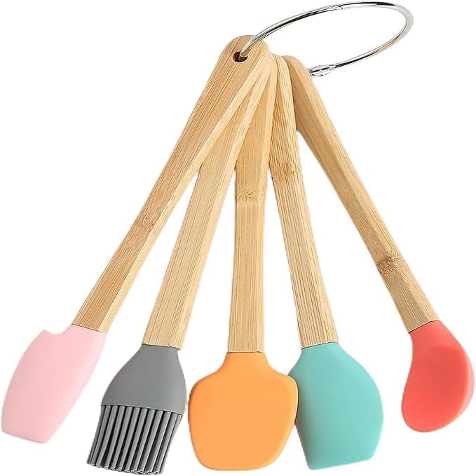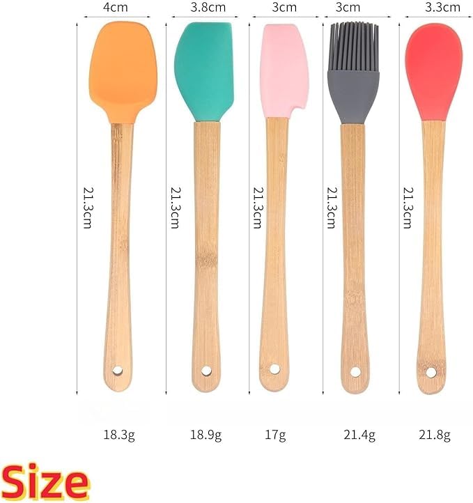 - مواد عالية الجودة: رؤوس من السيليكون الغذائي الآمن بألوان زاهية مع مقابض من الخشب الطبيعي المتين