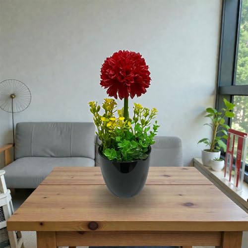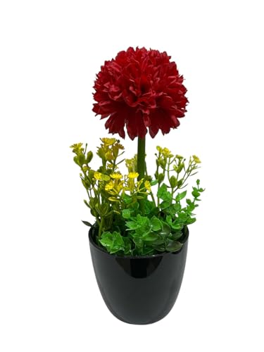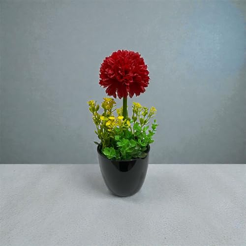 Generic - فازة صغيرة بوردة صناعية حمراء مع نباتات زينة، تصميم واقعي، وعاء أسود، ديكور منزلي ومكتبي