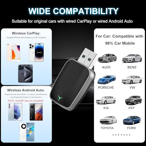 - ✨【توافق عالمي】مصمم خصيصًا للسيارات المزودة بكاربلاي السلكي، هذا المحول اللاسلكي كاربلاي متوافق مع أكثر من 800 طراز سيارة. يدعم نظام iOS 10 والإصدارات الأحدث على آيفون 6 أو أحدث، بالإضافة إلى أجهزة أندرويد التي تعمل بنظام أندرويد 11 وما فوق. يتضمن محول USB إلى USB-C، مما يضمن توافقًا سلسًا مع كل من منافذ USB وUSB-C للسيارة. (يمكنك مسح رمز الاستجابة السريعة للتحقق من توافق سيارتك قبل الشراء.)