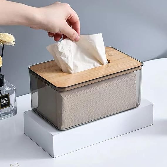 - [مادة ممتازة] - حامل المناديل الشفاف مع غطاء مصنوع من خشب الخيزران الطبيعي ومادة بي اي تي الشفافة عالية الجودة. تتميز مادة بي اي تي المتينة والمقاومة للسقوط بأنها لا تتشقق أو تنكسر بسهولة