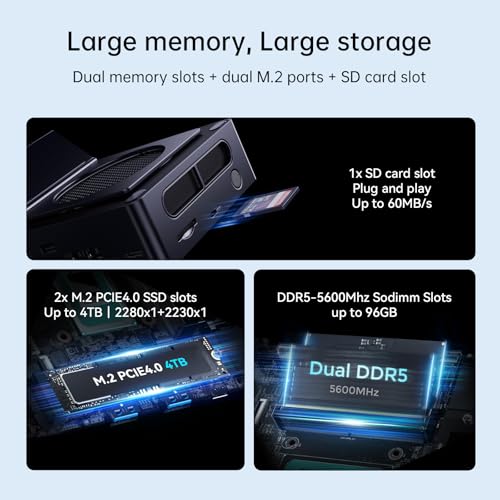 - 【ذاكرة وتخزين قابلة للتوسيع】يأتي جهاز الكمبيوتر الصغير UH125 برو مع فتحات DDR5 مزدوجة، يدعم ذاكرة تصل إلى 96 جيجابايت 5600 ميجاهرتز. فتحتان ام.2 (2280 منفذ الملحقات الإضافية السريع 4.0 تدعم ما يصل إلى 4 تيرابايت، 2230 منفذ الملحقات الإضافية السريع 4.0 تدعم حتى 2 تيرابايت) توفر وصولاً سريعًا للبيانات وسعة تخزين كبيرة. تتضمن فتحة بطاقة اس دي لمزيد من المرونة في التخزين..