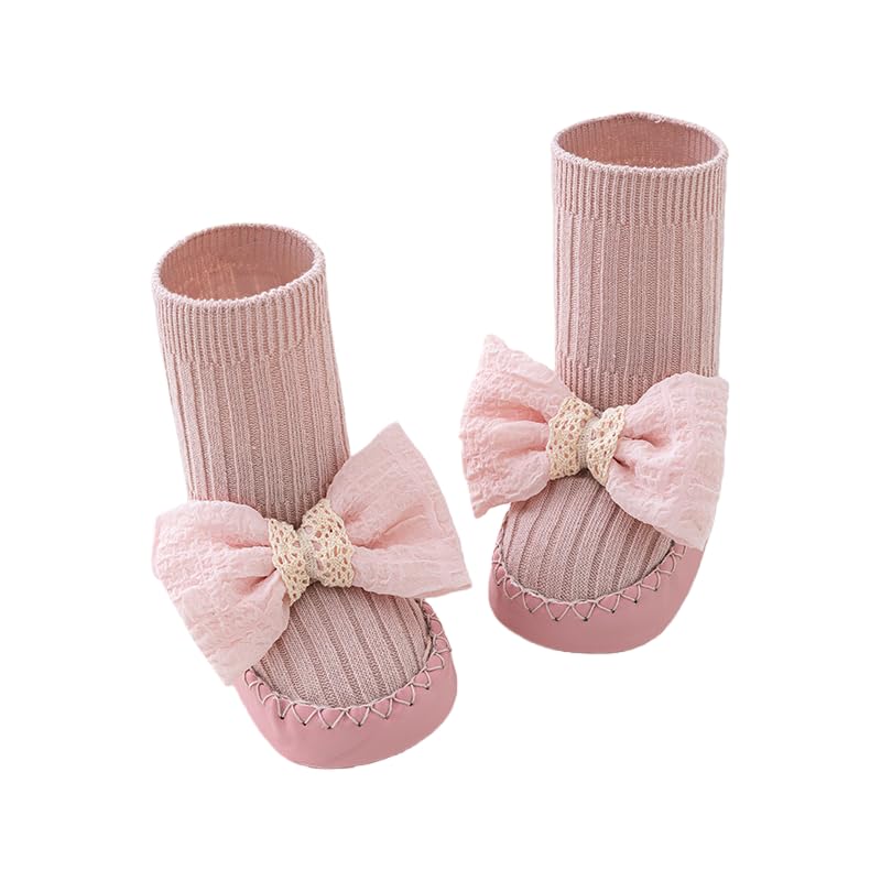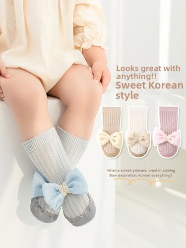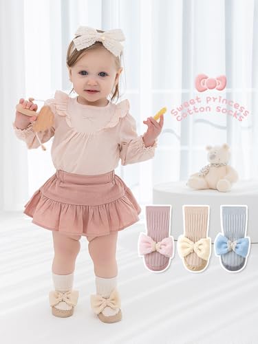 Mira Kids - شرابات قطن للبنات مزينة بفيونكة كبيرة، شرابات مضادة للانزلاق للمشي لعمر يوم واحد حتى 24 شهرًا من ميرا كيدز، مقاسات 11/12/13، ألوان متعددة (لون أبيض/بيج/وردي/أزرق)