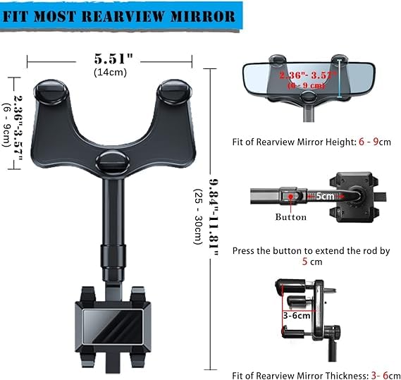 Generic - حامل هاتف يثبت على مراية السيارة قابل للدوران 360 درجة ومتعدد الوظائف وقابل للتعديل حامل موبايل عالمي لأنظمة الملاحة على الموبايل ونظام تحديد المواقع GPS قابل للدوران والسحب