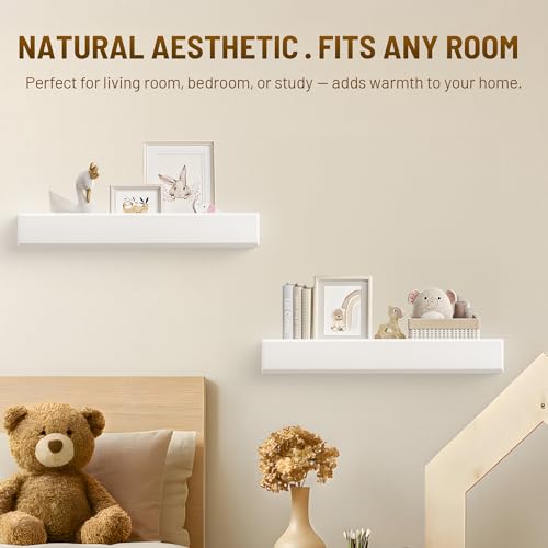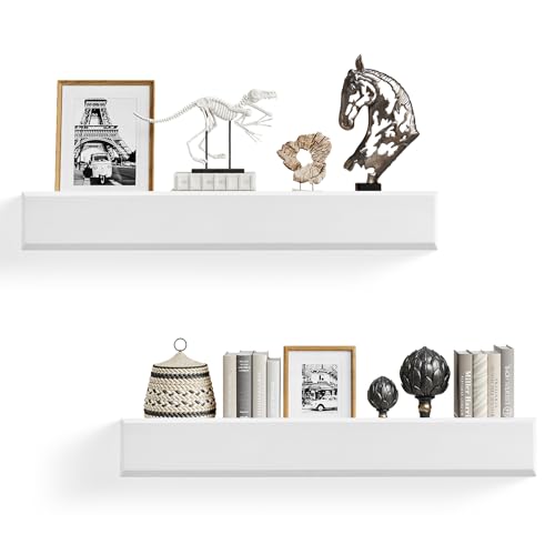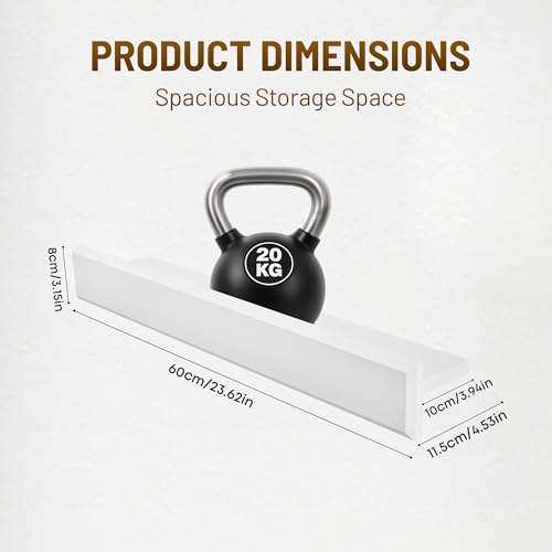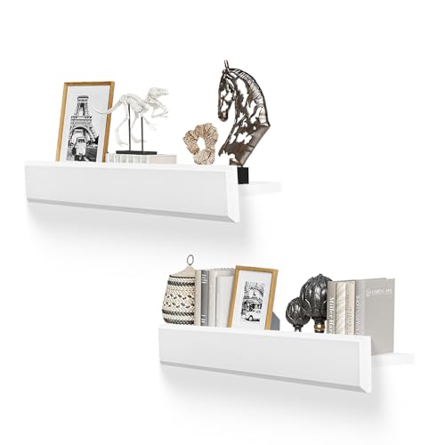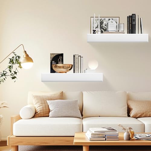 MITREL - ارفف عائمة على شكل حرف T مقاس 24 انش للجدار من ميتريل، مجموعة من رفين من خشب الصنوبر الصلب مع دعامات غير مرئية، تخزين حائط لغرفة المعيشة وغرفة النوم والمطبخ والحمام (ابيض)