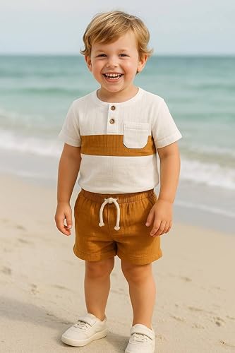 Meza - طقم أطفال أولاد صيفي مكون من تيشيرت بأزرار وشورت برباط خامة قطنية خفيفة ومريحة للنشاط اليومي من ميزا