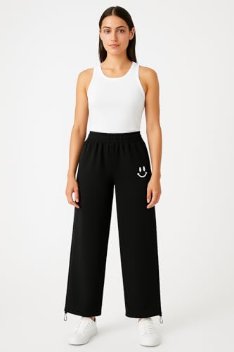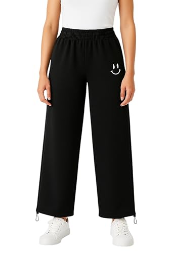 Meza - بنطلون رياضي واسع برباط مطاطي مرن وطبعة سموثي كاجوال للرياضة والجيم والمنزل والكاجوال مع حبل سحب فى القدم مع ابتسامة مطبوعة لبنات والنساء من ميزا