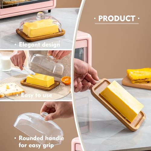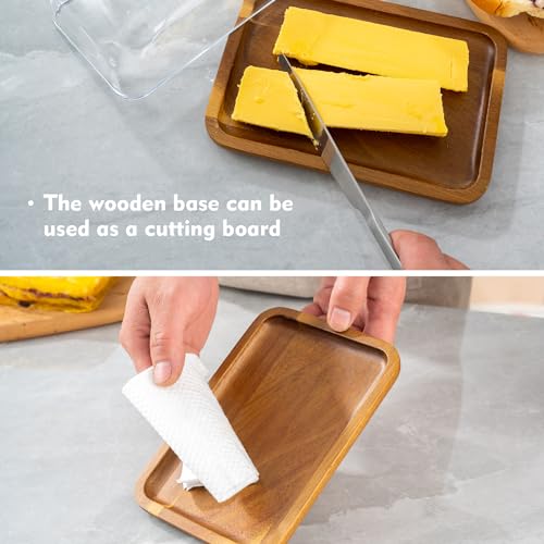 MKLZ - طبق زبدة زجاجي مع غطاء خشبي، طبق جبن مقبب كبير مع مقبض، حافظة زبدة مع غطاء للطاولة، منضدة المطبخ، الثلاجة