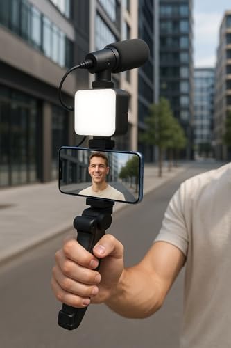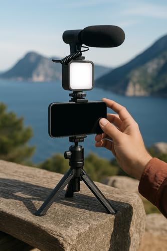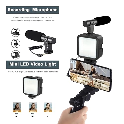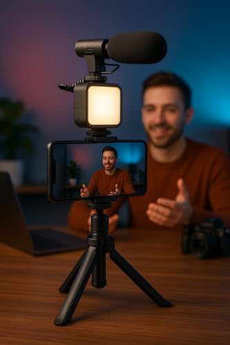 - طقم تصوير متكامل: يشمل حامل هاتف محمول مع إضاءة LED مربعة 6.5 سم × 6.5 سم وميكروفون وحامل ثلاثي القوائم