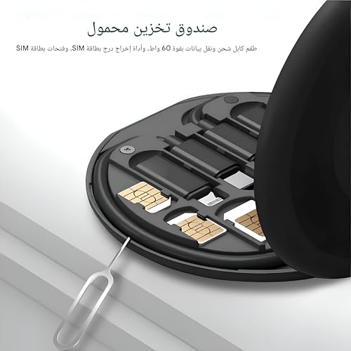 - من أبرز مميزات هذا المنتج هي علبة التخزين متعددة الوظائف هذه. لا يحافظ على الكابلات والمحولات منظمة فحسب، بل يعمل أيضًا كحامل للموبايل مما يسمح لك بمشاهدة مقاطع الفيديو أو مكالمات الفيديو بدون استخدام اليدين. العلبة مزودة بدبوس لإخراج شريحة الاتصال SIM وتحتوي على ثلاثة فتحات تخزين مخصصة لشريحتين اتصال نانو وشريحة مايكرو واحدة، مما يسهل تبديل وتخزين شرائح الاتصال SIM لديك بأمان أثناء السفر.