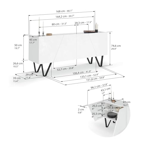 - التصميم: يبلغ مقاس خزانة ايما الجانبية 1.68 م × 74.5 سم × 45 سم، وهي مجهزة بـ 4 أبواب بقطع قطري عصري ومفصلات بطيئة وقابلة للتعديل. تفتح الأبواب بدون مقابض من الأعلى وتسحبها نحوك. تحتوي كل مساحة تخزين داخلية على رف ثابت لتحسين المساحة، والجزء الخلفي من الخزانة مغلق. يمكن للطبقة العلوية حمل ما يصل إلى 50 كجم موزعة على السطح، بينما تحمل الأرفف الداخلية ما يصل إلى 25 كجم لكل منها. المنتجات الأخرى الموجودة في الصور غير متضمنة.