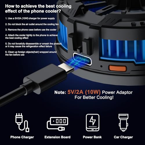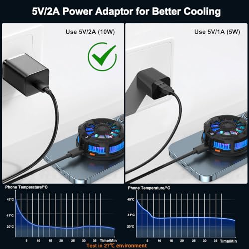 - 【ملاحظة】محول طاقة 5V/2A (10W) لتبريد أفضل، يعمل مبرد الهاتف لأكثر من 10 دقائق، وتميل درجة الحرارة المعروضة على المبرد إلى الاستقرار.